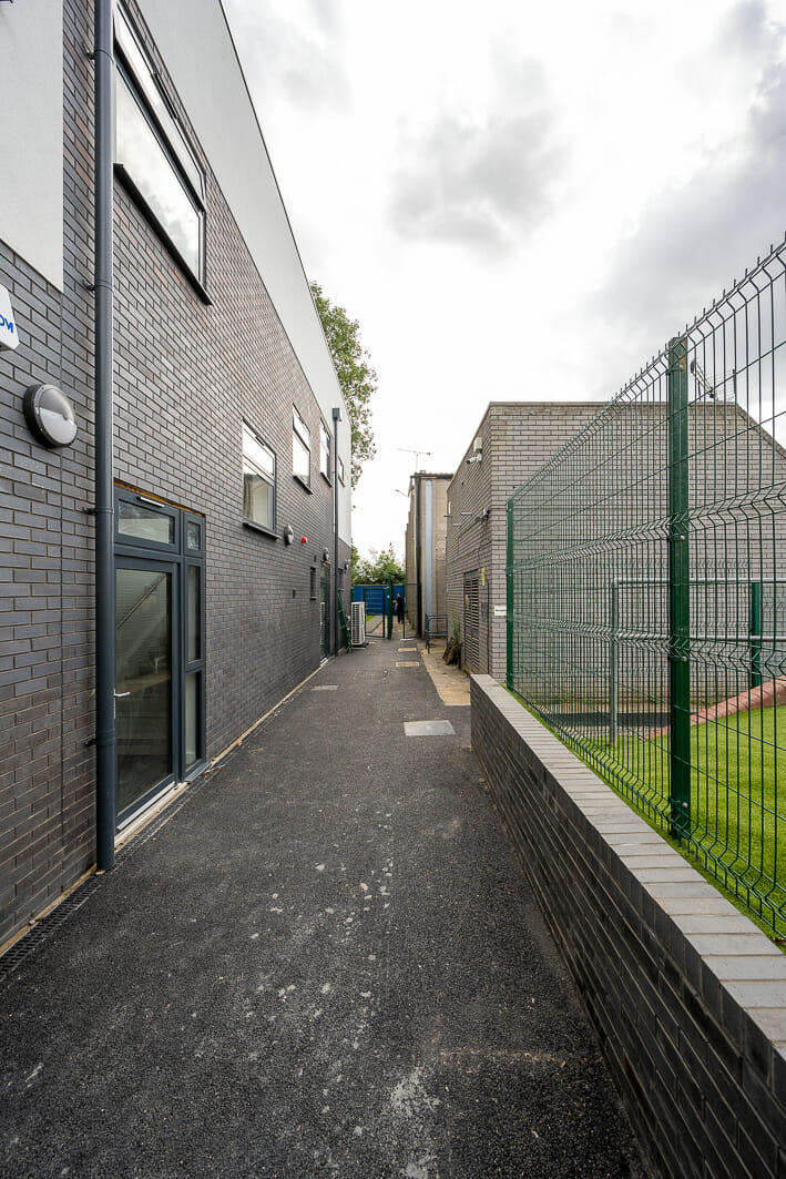 The new build two storey teaching block features steel frame with Metsec and enhanced the school street elevations via its modern design comprising of a mixture of render, masonry and powder coated sunshading.
