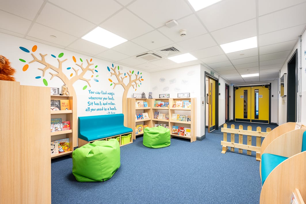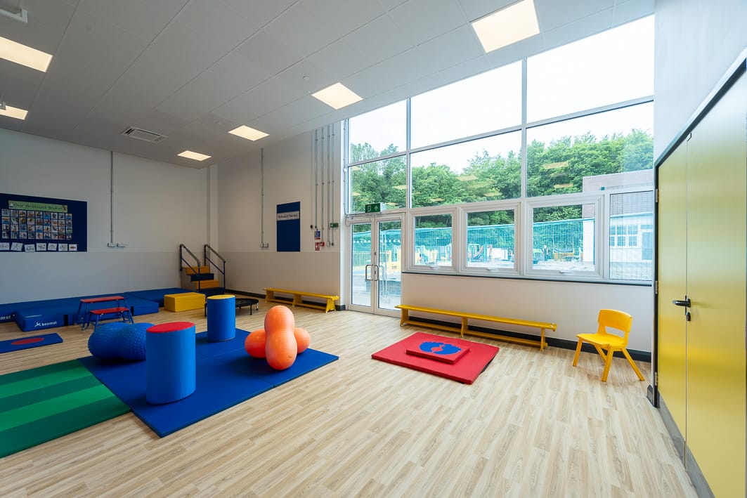 The school was designed to fully cater for SEND children needs. Fully wheelchair accessible teaching areas are acoustics treated, all rooms have sensory lights, and the temperature is regulated independently.