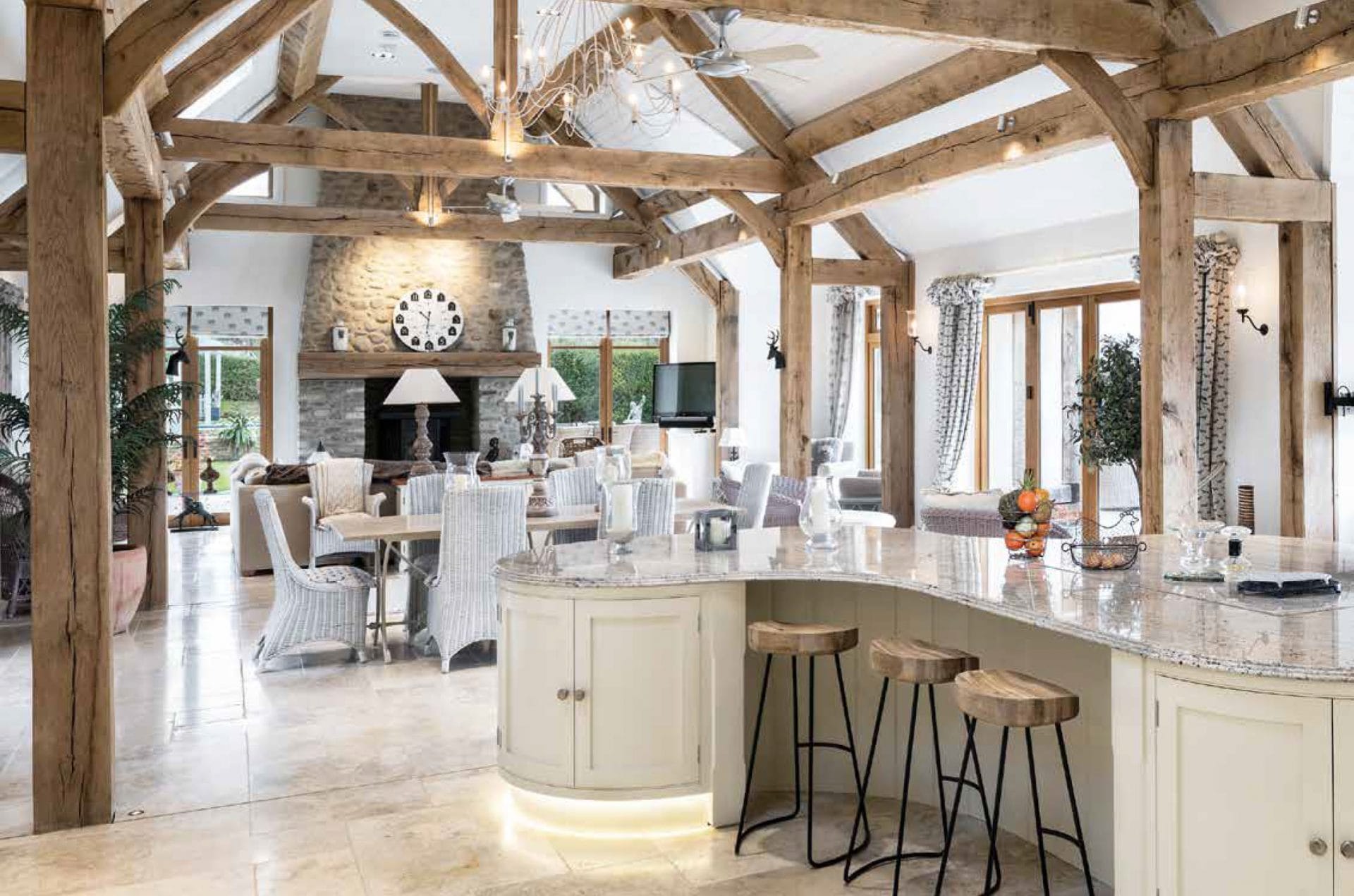 A vaulted kitchen/breakfast room features an exposed oak frame with panelling, and granite worktops together with wall and floor units.