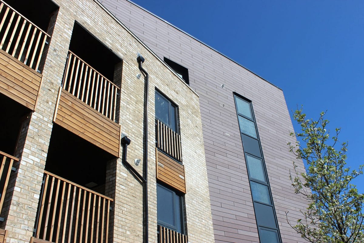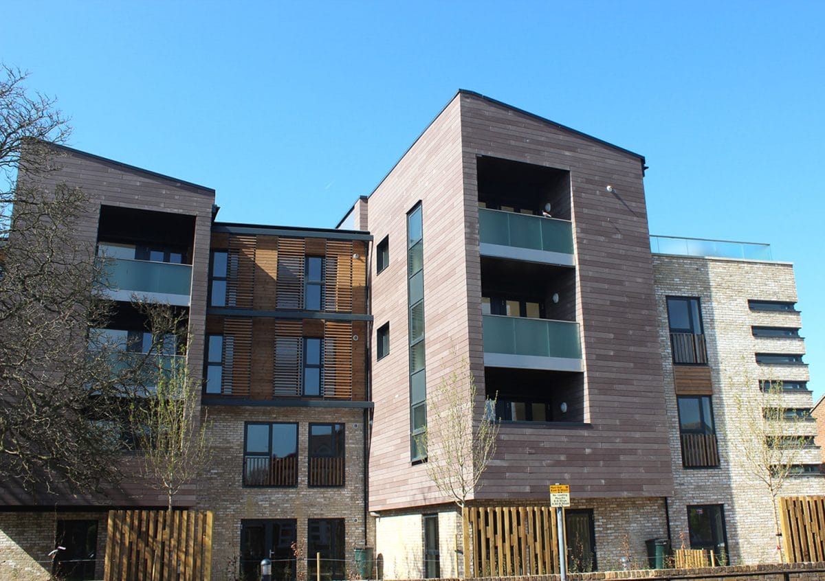 The flats are a traditional brick / block construction, with a single ply membrane roof covering. The external façades consist of Oko skin concrete cladding, brickwork, Thermowood timber cladding, Juliette balconies and sun screens with a vertical solar shading. With differing specifications for finishes to the shared ownership and affordable units, the apartments have MVHR (mechanical ventilation heat recovery) units, and radiator central heating. The main bathrooms are fitted with bath and shower units.