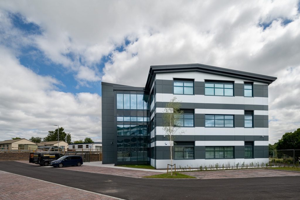 The three high-specification office buildings were constructed with a steel frame on concrete pad foundations, with beam and block ground floor on concrete ground beam foundations, together with a vented cavity and an engineering brick plinth.